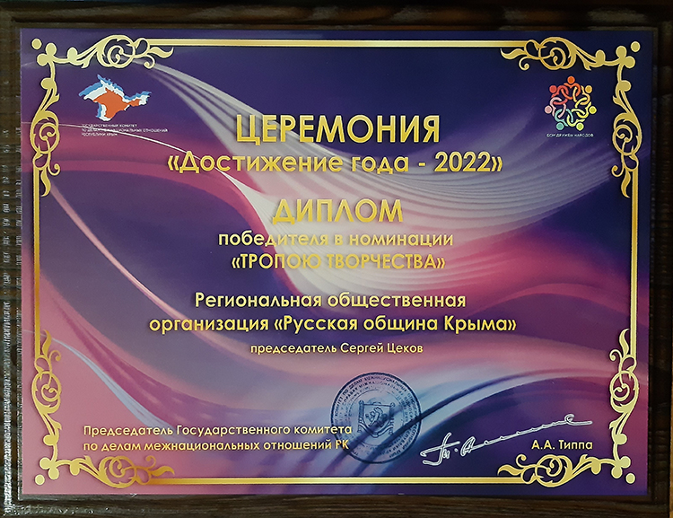 В г. Симферополе состоялась церемония «Достижение года» с участием национально-культурных объединений Республики Крым. Мероприятие было организовано и проведено ГБУ РК «Дом дружбы народов». Проект направлен на выявление и поощрение лучших практик в области межнациональных отношений. В ходе церемонии диплом победителя в номинации «Тропою творчества» получил заместитель председателя Симферопольской городской организации Русской общины Крыма, руководитель Крымского культурного общества «Таврика» Максим Кутяев. Была отмечена роль Русской общины Крыма и её председателя Серея Цекова в поддержке работы ККО «Таврика».
