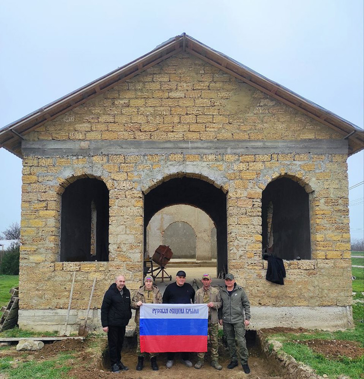 Активисты Джанкойской городской организации Русской общины Крыма А.Филин, В. Антифеев, С. Гринь, И. Илюшко, Б. Суворов и участники СВО В. Шмаков и В. Сушко продолжают оказывать помощь в строительстве православного храма в Джанкойском районе. В данный момент идут монтажные работы по установке крыши на алтарной части храма.